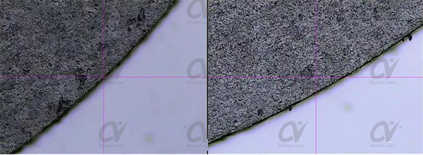 切割結(jié)果及分析:從切割樣件照片可以看出:1. 顯微鏡上看切割后的藍(lán)寶石邊緣光滑、基本無(wú)掛渣、無(wú)毛刺;2. 切割面幾乎無(wú)坡度,錐度在100以內(nèi);3. 藍(lán)寶石正面切割邊緣效果較好,崩邊尺寸的崩變量較背面崩邊尺寸小,背面崩邊量也控制在10μm以下。